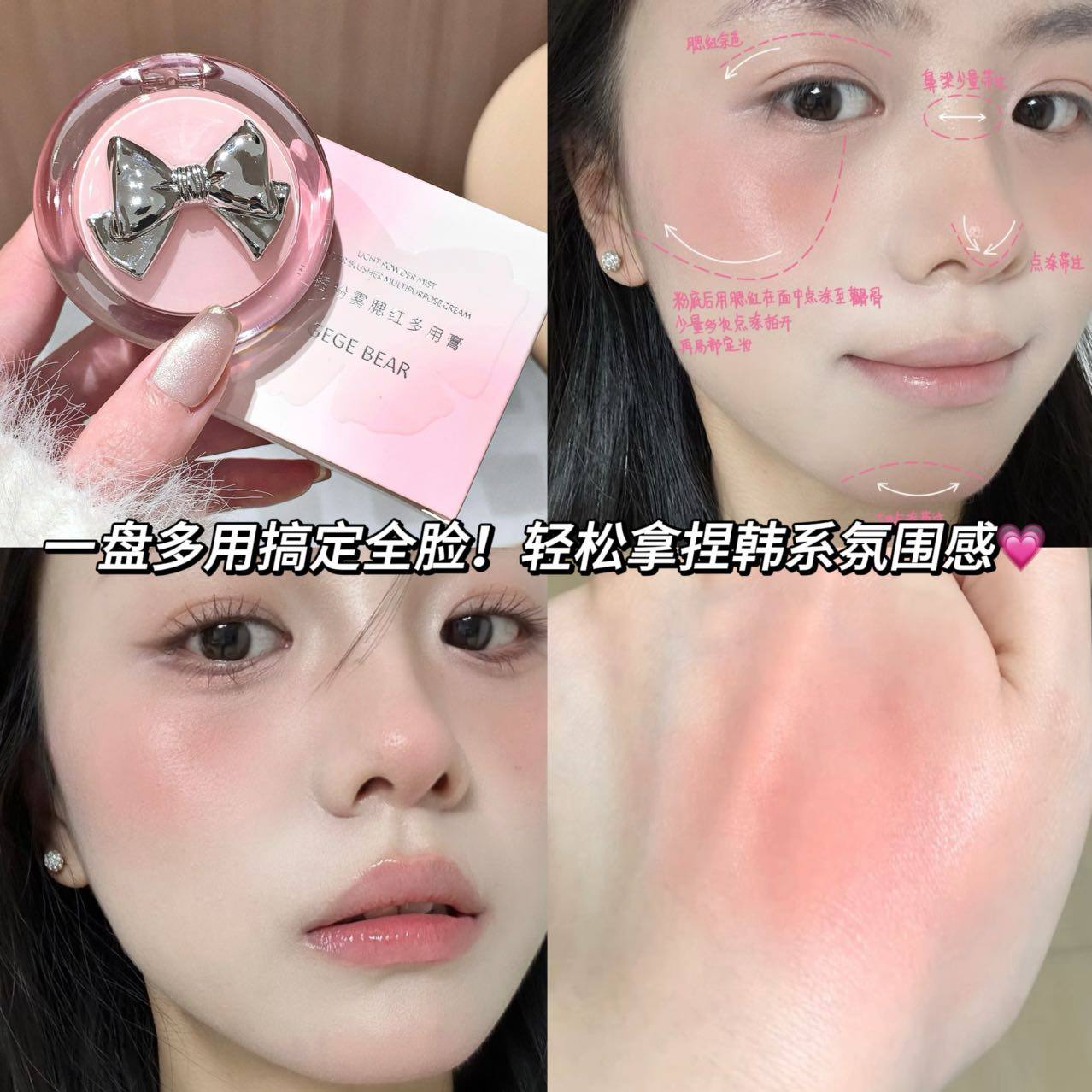 رژگونه پاپیونی GeGe Bear با بافت نرم و خیس خود، بهراحتی روی پوست پخش میشود و جلوهای طبیعی و شاداب به چهره میبخشد. میزان رنگدهی ملایم تا متوسط این محصول امکان لایهسازی را فراهم کرده و آن را به گزینهای مناسب برای آرایشهای روزانه و سبک تبدیل میکند. بستهبندی فانتزی و شفاف همراه با پاپیون آینهای، این رژگونه را به انتخابی جذاب برای علاقهمندان به استایلهای فانتزی و دخترانه تبدیل کرده است.